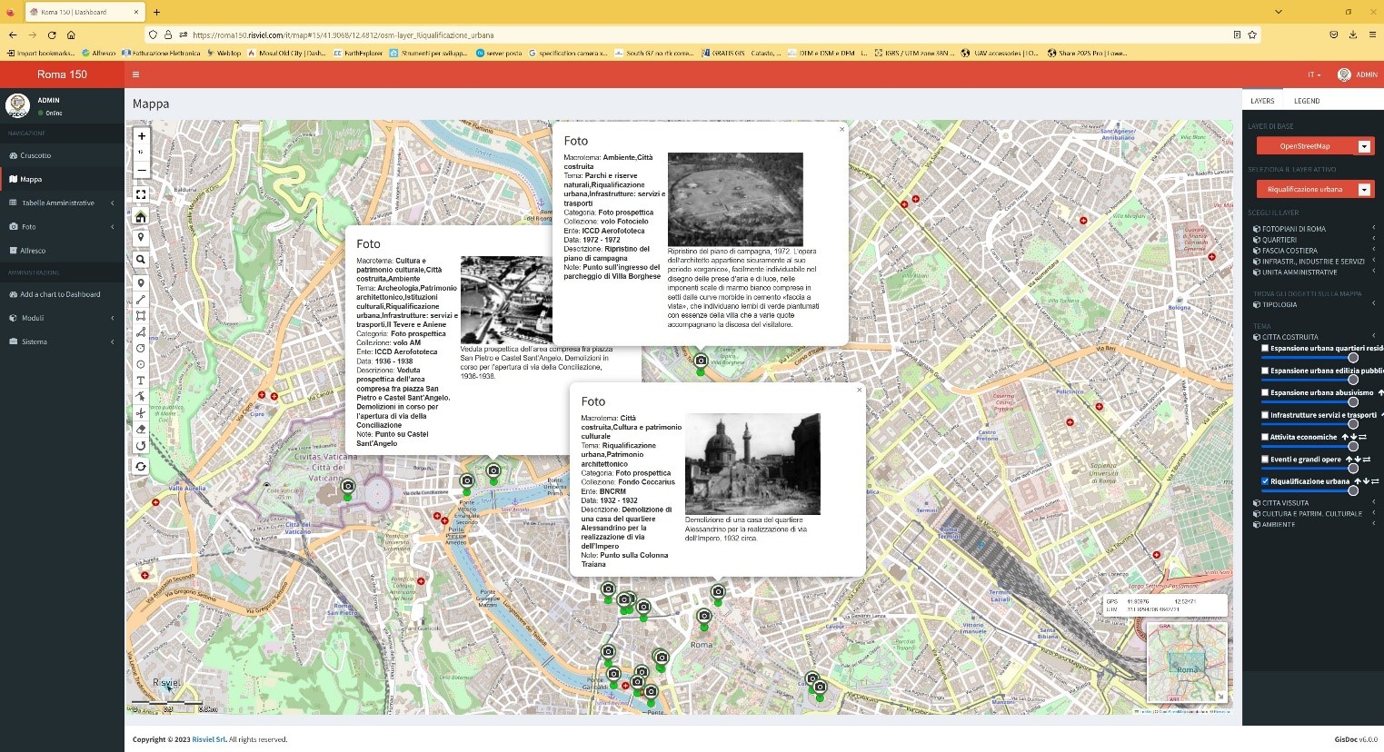 The ROMA150 platform will develop technologies based on WebGIS systems to integrate territorial information of a historical nature with different levels of spatial and informative detail. Technological innovation is represented by the implementation in the system of the "fourth dimension", time, which will make it possible to dynamically visualize historical material and explore issues related to urban and environmental transformations, the economic dimension and socio-economic characteristics. culture of the territories. The use of "augmented reality" functions and latest generation photogrammetric reconstruction and orientation techniques will make it possible to obtain additional information on some places under investigation, thanks to the possibility of returning floor plans and 3D models starting from the photographic and cartographic material available in the various funds studied, thus allowing the detailed analysis of building transformations over time.